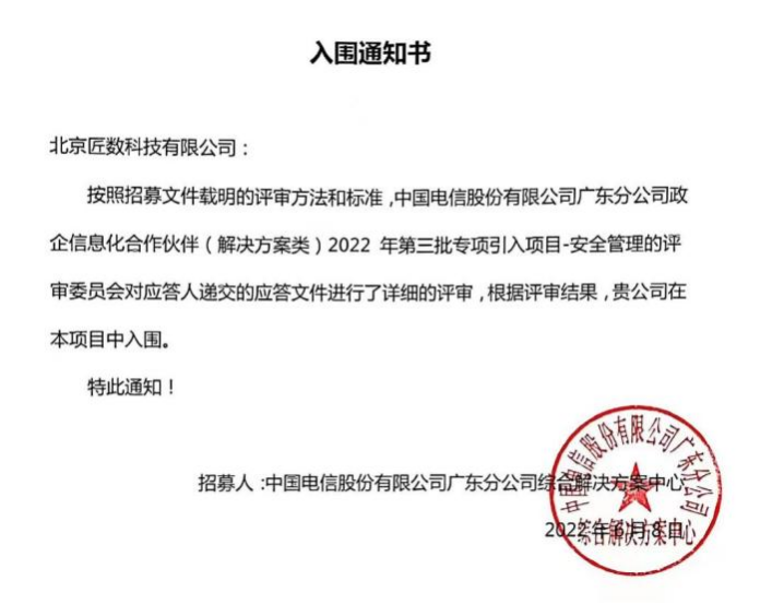 近日,匠数科技凭借AI技术能力、云服务产品及多年内容安全领域的服务经验,在中国电信股份有限公司广东分公司政企合作伙伴招募项目中,通过投标、资格审查等严格的考核,成功入围【安全管理】合作类别。